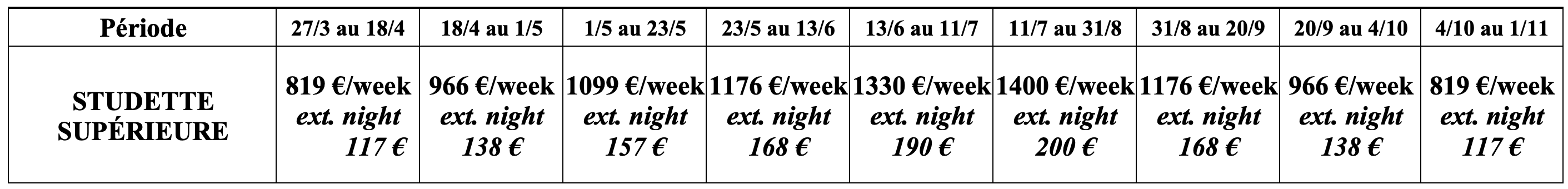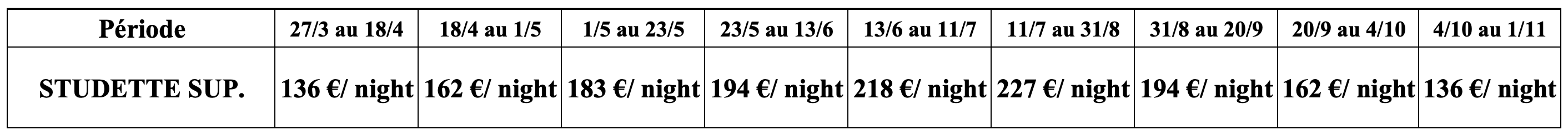 - Linen service (sheets + towels + dishtowels): 42 €/week.