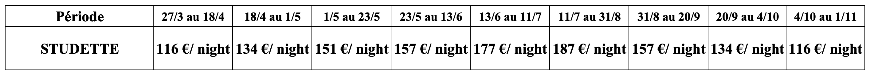 Close to the swimming pool, 3 studettes at garden floor of 23 m² (from n° 12 to 15) – 2 people maximum.