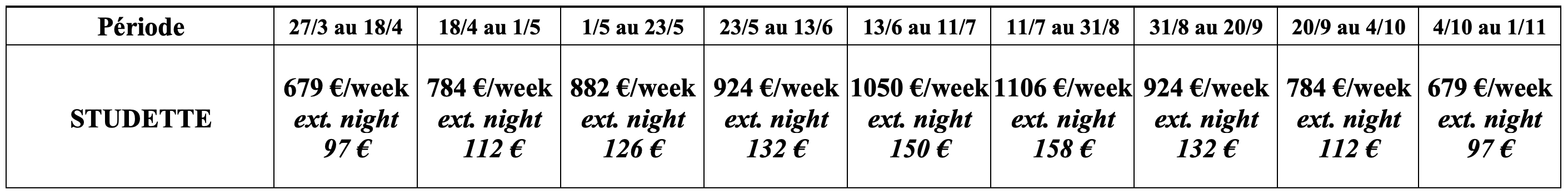 - Linen service (sheets + towels + dishtowels): 42 €/week.