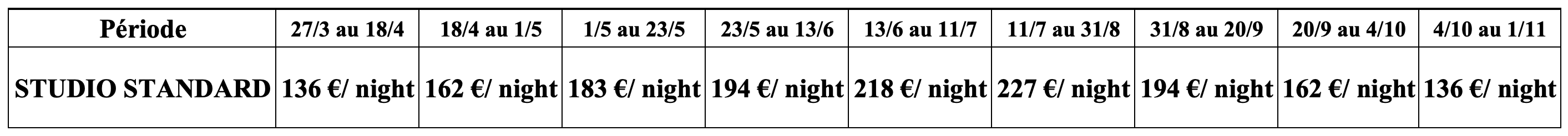 - Linen service (sheets + towels + dishtowels): 42 €/week.