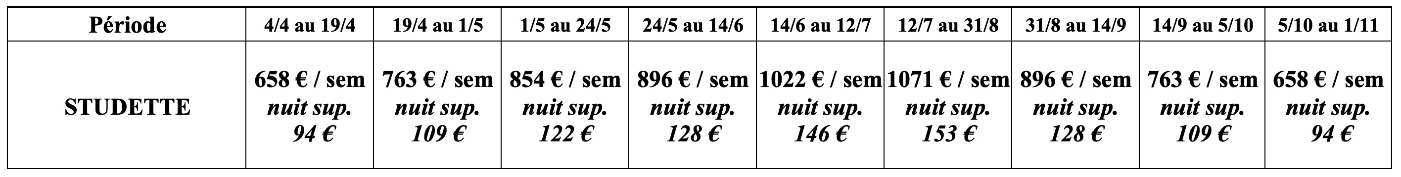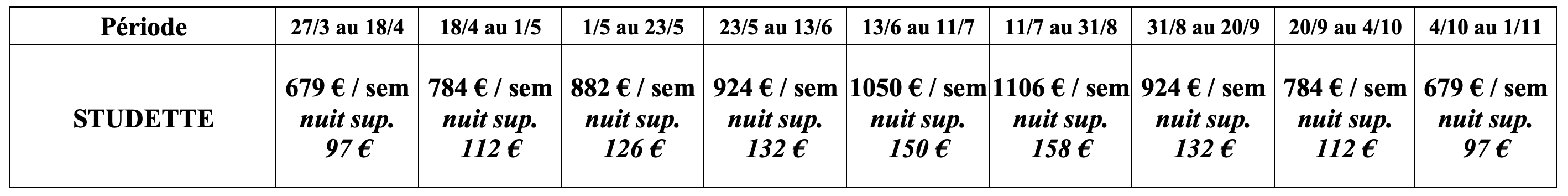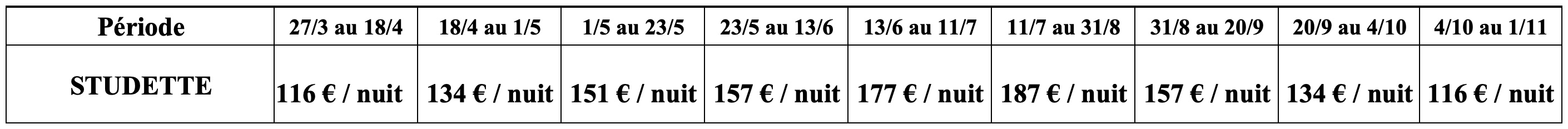 - Taxe de séjour : 1,15 € par nuit et par personne.
