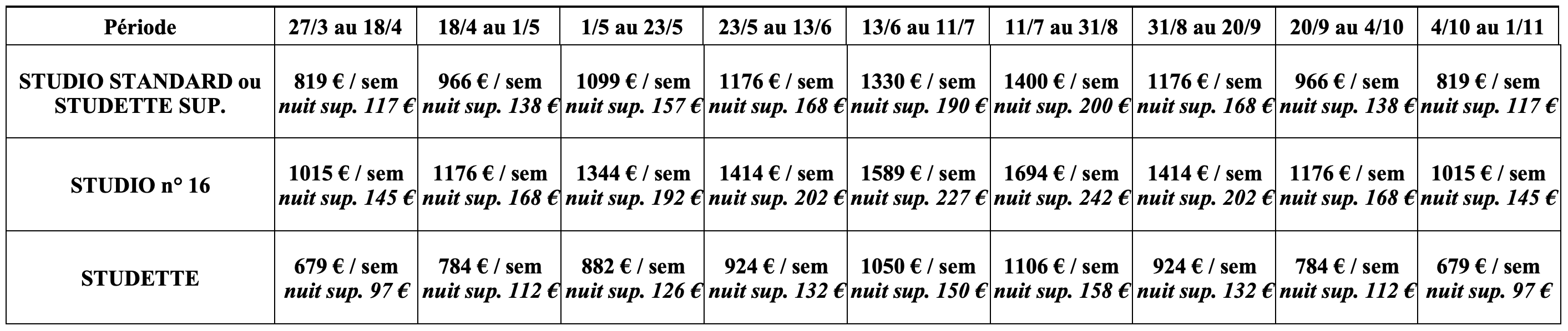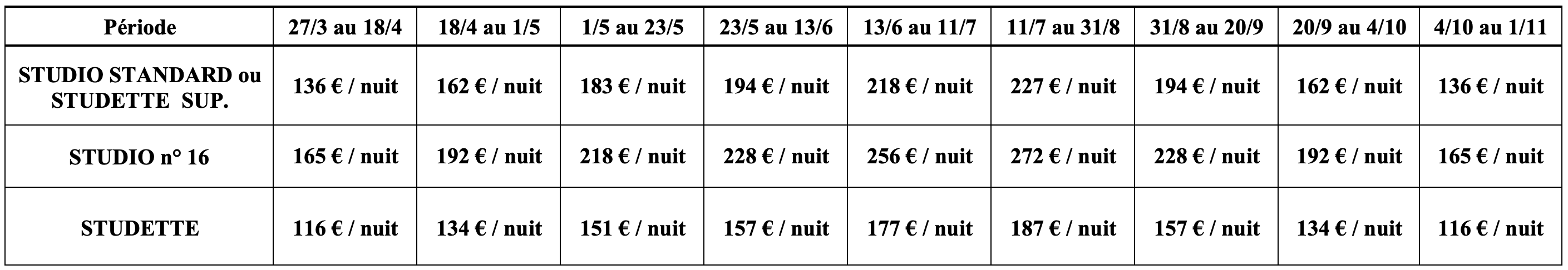 - Studio Standard et Studio n°16 : 3ème personne 30 € par nuit (maximum 3 personnes).