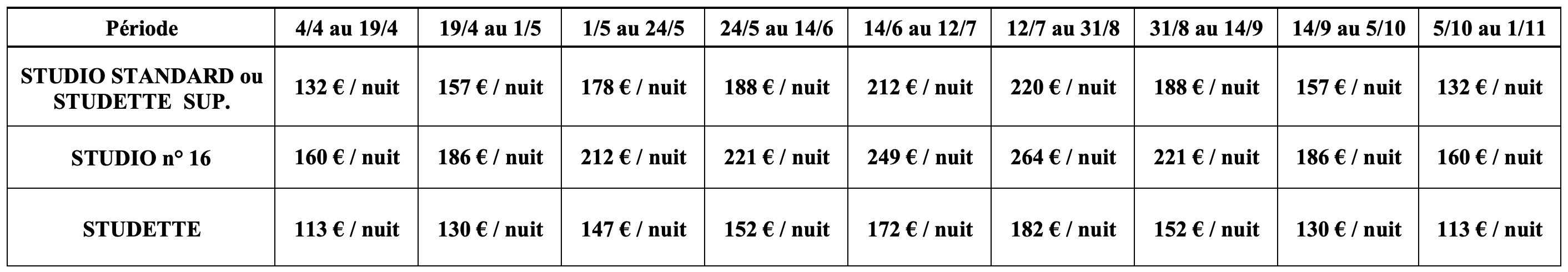 - Studio Standard et Studio n°16 : 3ème personne 30 € par nuit (maximum 3 personnes).