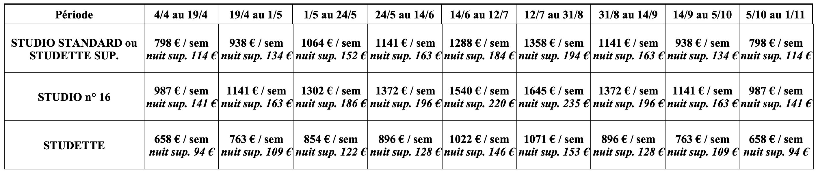 - Nettoyage final : 50 €/studio n°16, 45 €/studio standard, 40 €/studette supérieure et 30 €/studette.